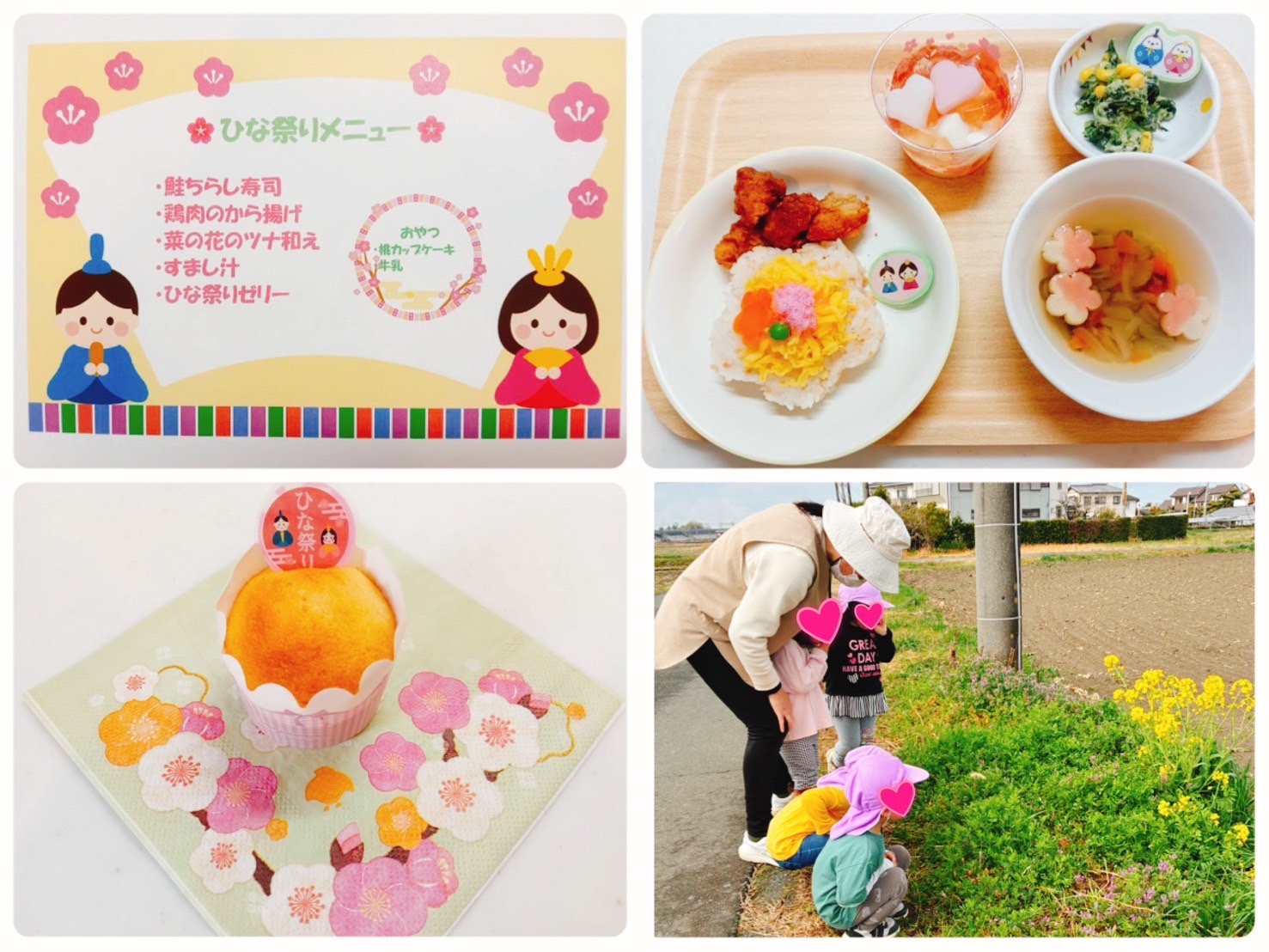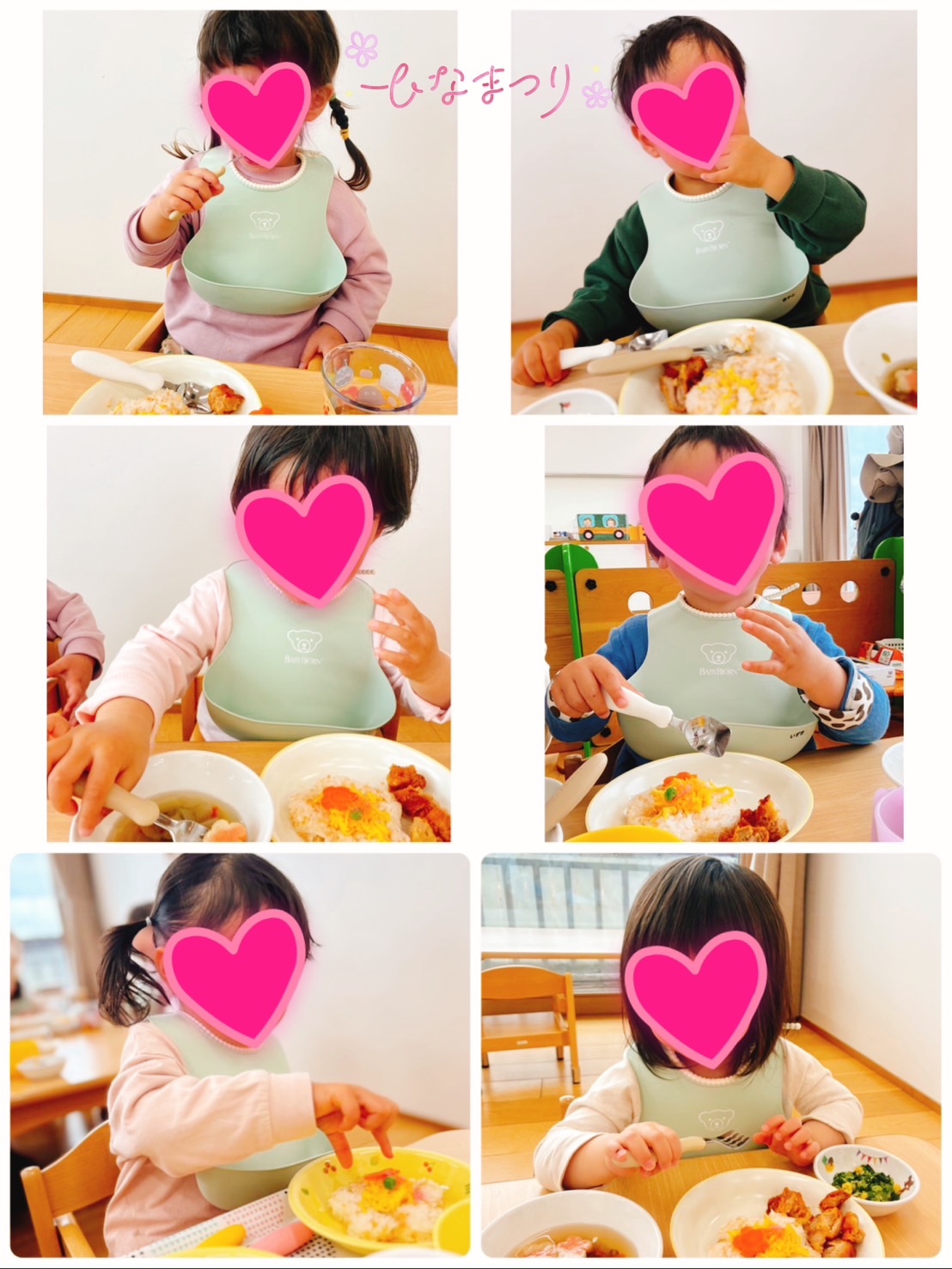 給食もひな祭りメニューで、お花形の人参や、ハート型のデザートを見て嬉しそうにパクり!おいしそうに食べている姿が見られました💕