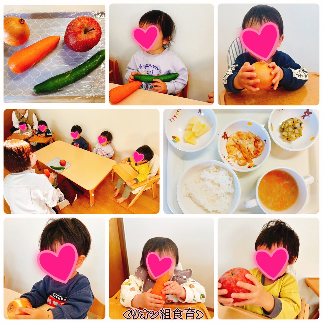 ラパン組では今年度初めて野菜を触ってみました。絵本で見た事のある野菜だったので、自分から手を伸ばして触れていました😊