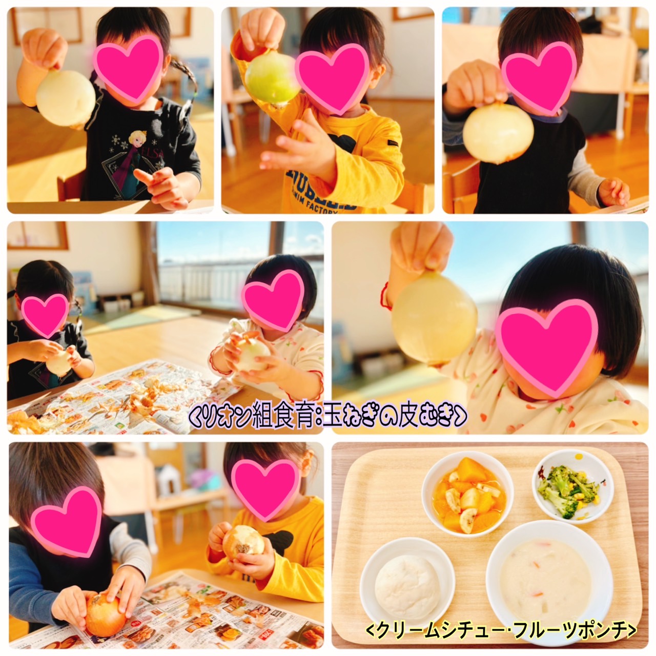 最近の食育と給食の紹介です。リオン組では玉ねぎの皮剥きのお手伝いや、おやつクッキングで五平餅を作りました。玉ねぎは1人1個ずつ上手に剥いて給食室に届けてくれました✨